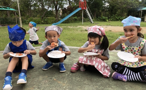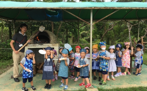 On the next day, they rolled out the dough, put the toppings on it, and baked it with the pizza kiln at the playground.
