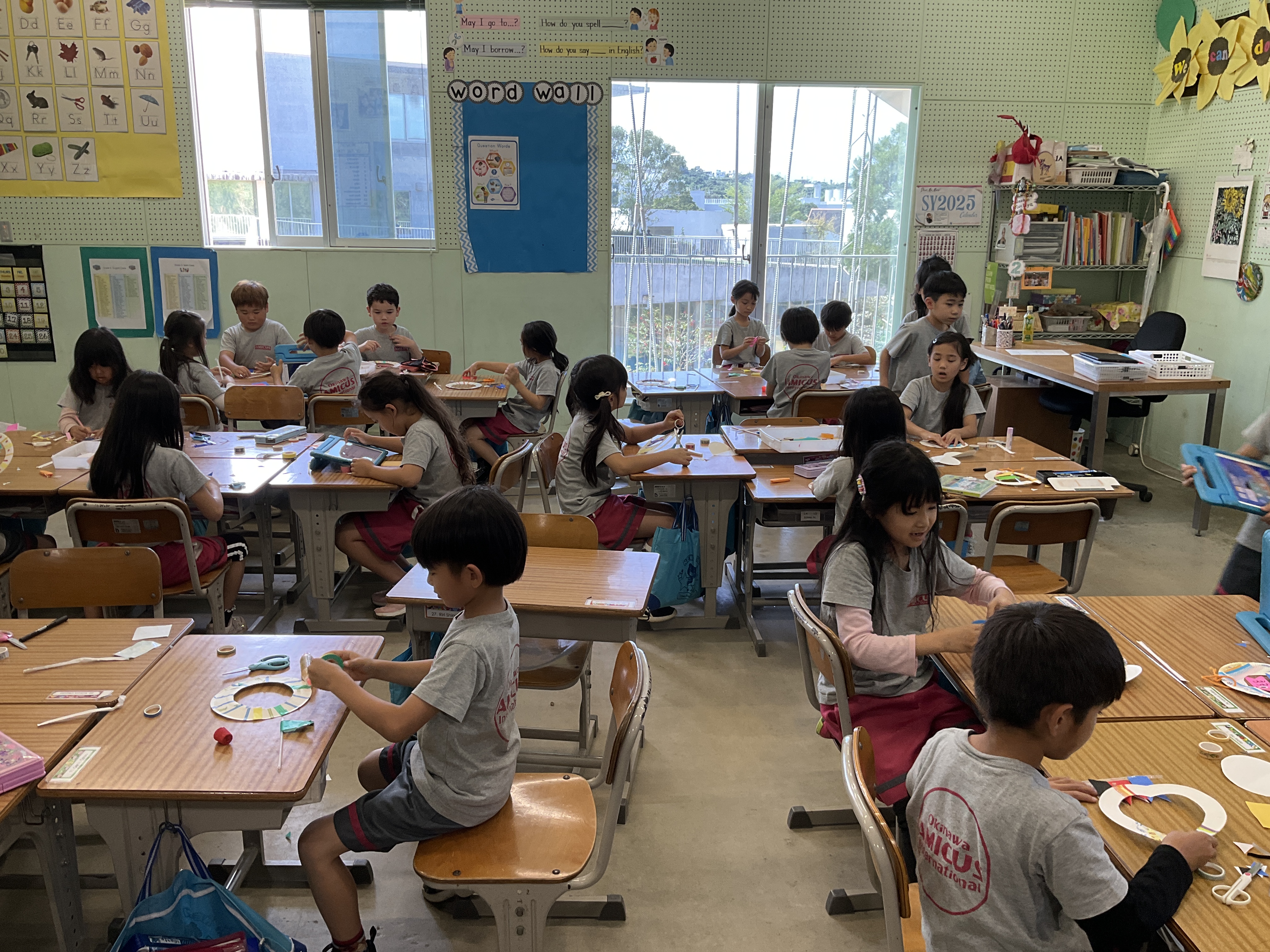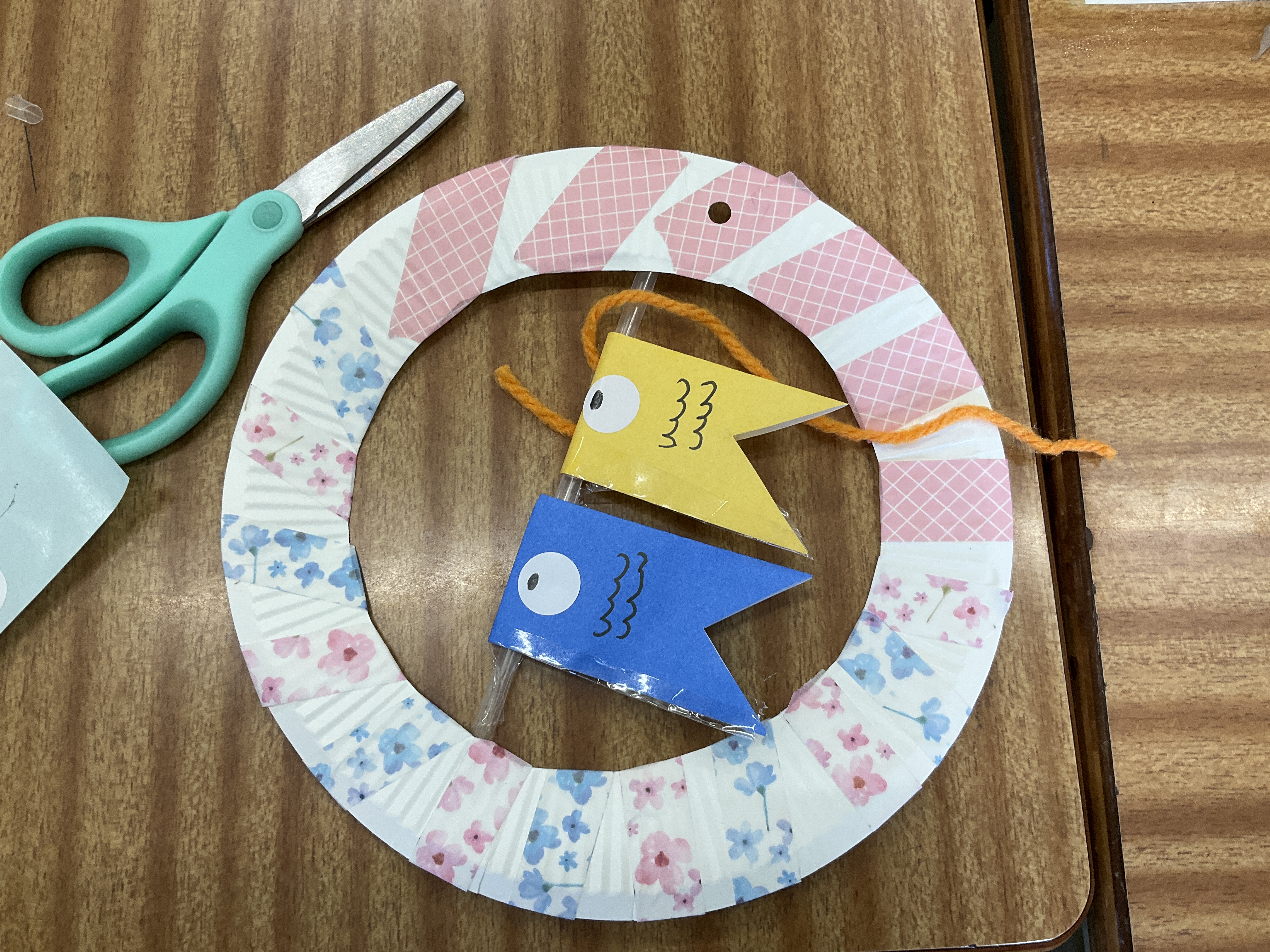 They were making fun crafts like koinobori (carp streamers) and kabuto (samurai helmets), using colorful origami paper, tape, and markers. Everyone was full of energy and excited to bring their own ideas to life!