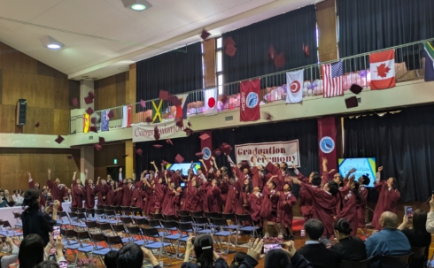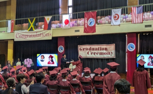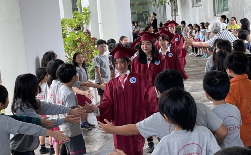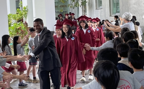 On a beautiful, sunny day, following the kindergarten and junior high school ceremonies, AMICUS Elementary School held its graduation ceremony.