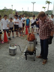 木曜日、6Cの生徒がアメリカのサンクスギビング料理体験をしました。ジョンストンさんとジョエルさんが大きな3羽の七面鳥を揚げている横で、子ども達は保護者の手助けを借りながらレシピを見てサイドディッシュを作りました。