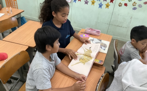 幼稚園生と5年生、1年生と6年生、2年生と7年生、3年生と8年生、4年生と9年生がバディとなり、お兄さん・お姉さんが後輩へ絵本の読み聞かせをしました。