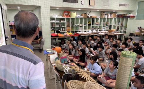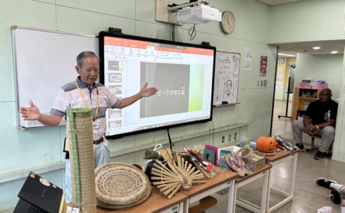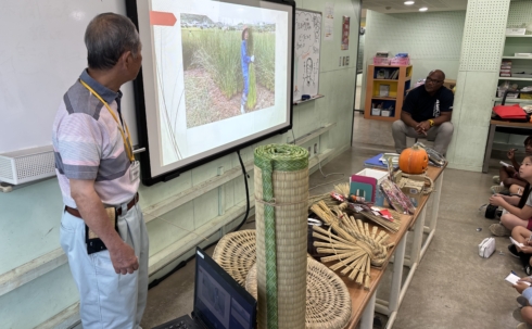 続いて、うるま市照間でビーグ(い草)を育てる農家であり、畳職人でもある兼城さんを学校にお招きし、地元の特産品について学びました。