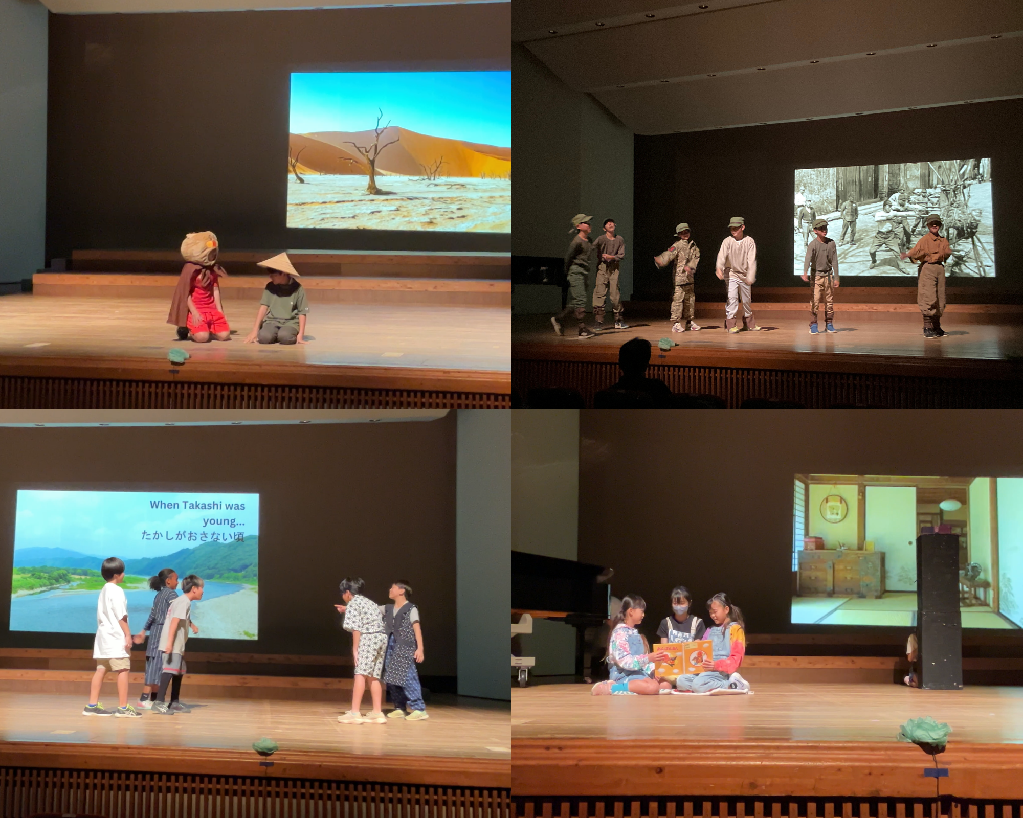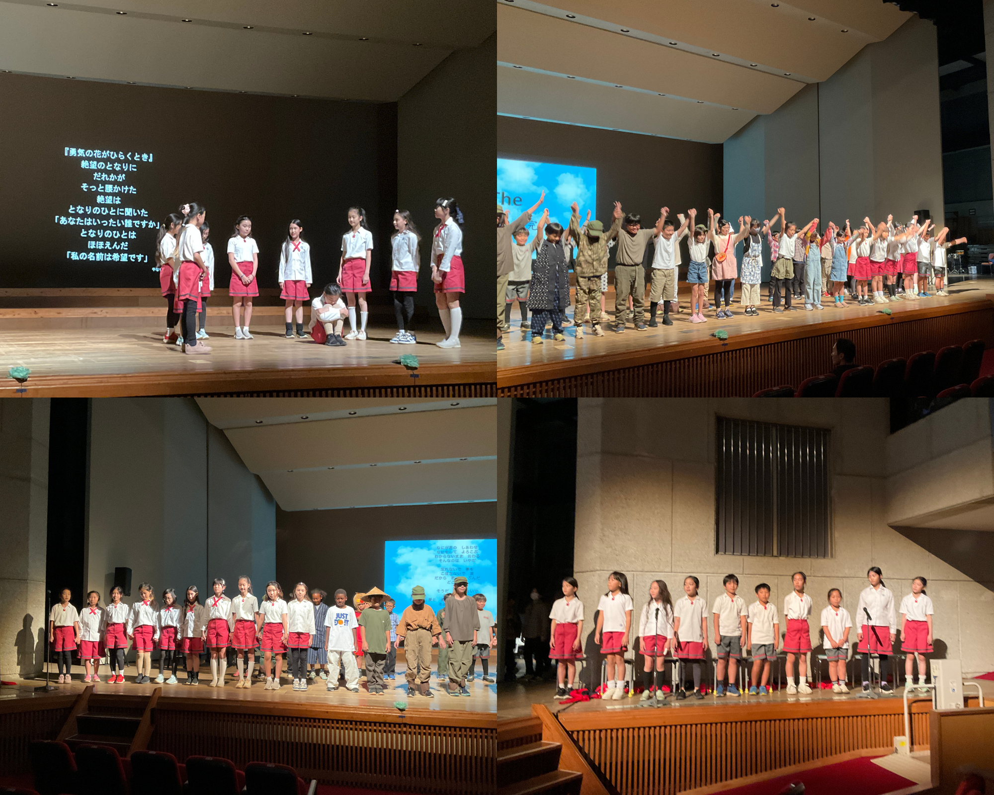 今回の全体テーマは「平和」。前半は劇、後半は音楽の発表と、学年ごとに異なる表現で平和への思いを伝えました。