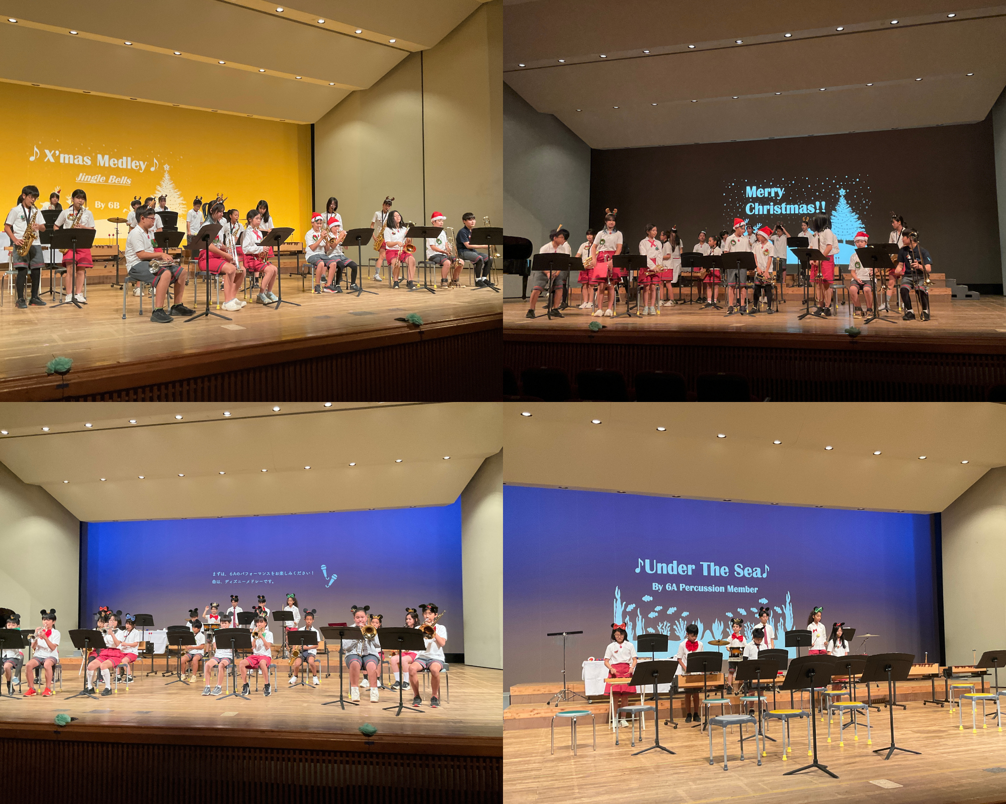 6年生は、夏休み前から練習を重ねてきた楽器で、ディズニーメドレーとクリスマスメドレーを合奏しました。会場中が思わず口ずさみたくなるような、親しみある楽しい曲で、会場を笑顔と楽しさでいっぱいにしてくれました。