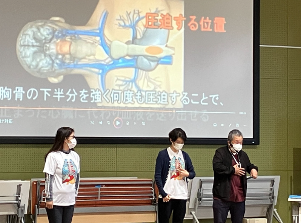 覗いてみると、中学2年生の生徒がCPR(心肺蘇生法)の実演をしているところでした。