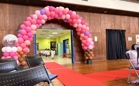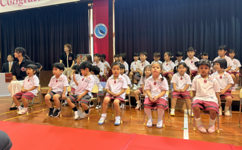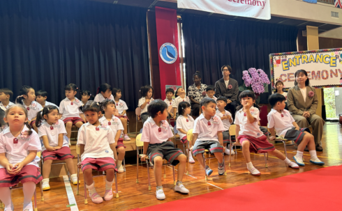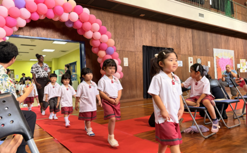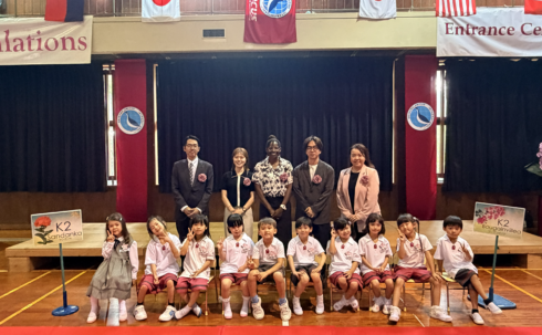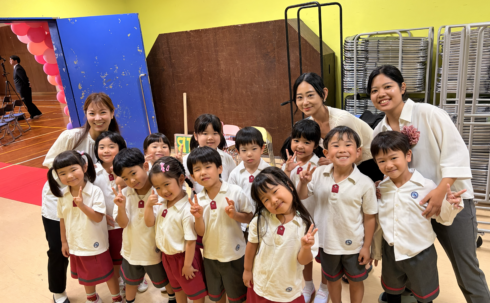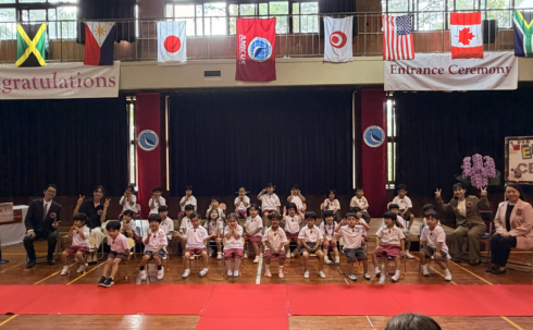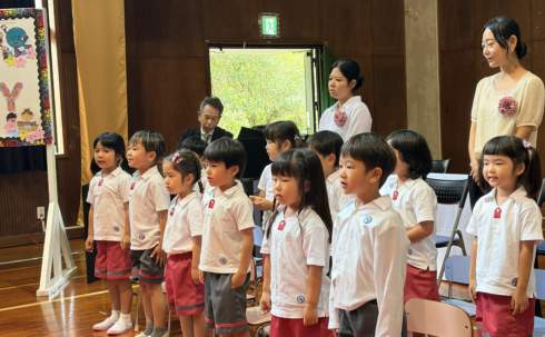 この日は、預かり保育で通っている在校生の年長クラスのお友だちも、応援に駆けつけてくれました。職員と預かり保育のみんなで歓迎の気持ちを込めて校歌を歌い、会場はやさしい空気に包まれました。
