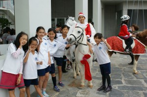 アミークスキッズクラブの中にあるUMABU(乗馬クラブ)の子どもたちがクリスマスコスチュームに身を包み、馬たちとともに回廊を練り歩きました。馬が現れた瞬間、パレードを見に来た子どもたちが興奮!15分と短い時間ではありましたが、1年に1度のパレードを今年も楽しく終えることができました。